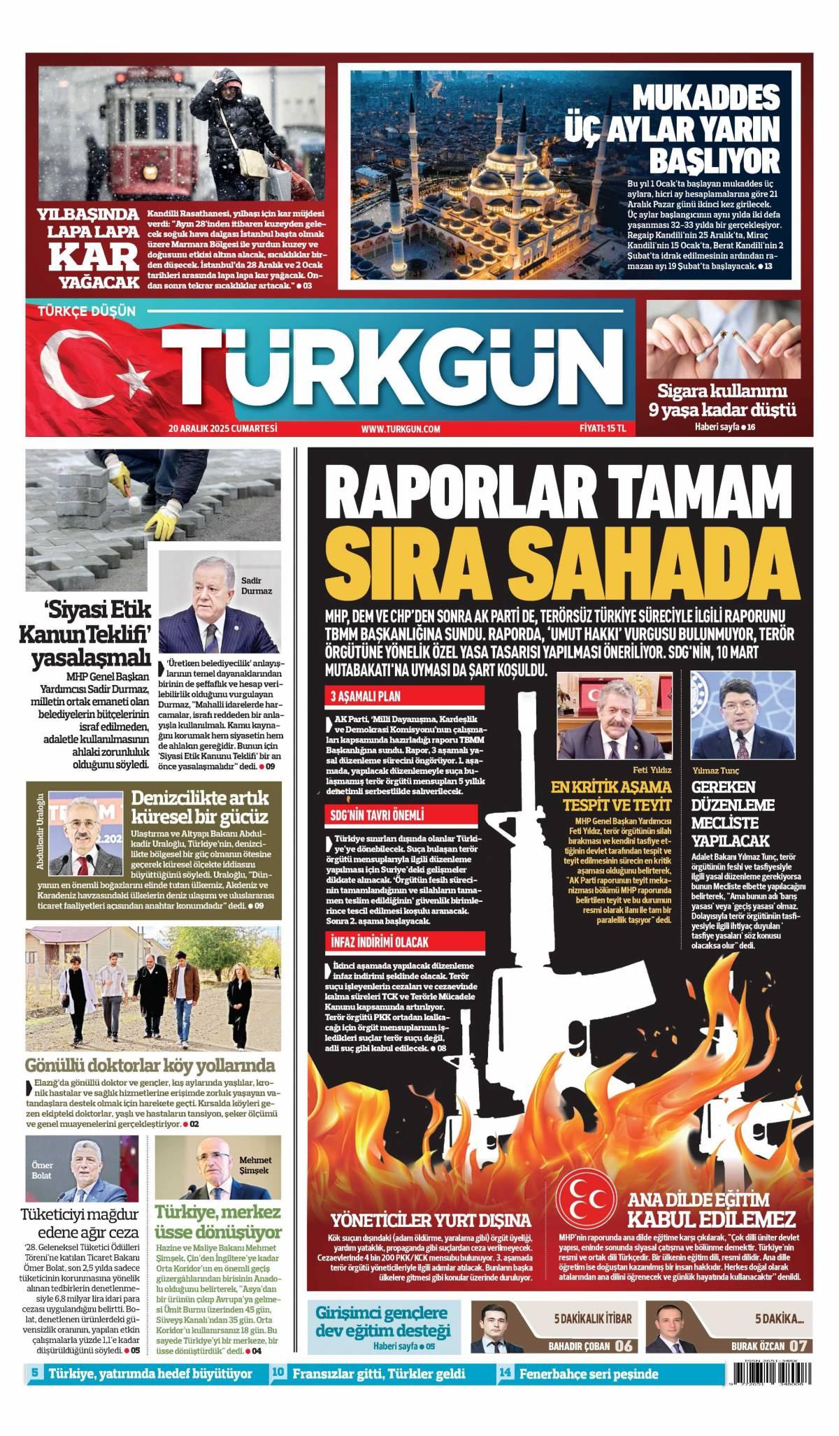 Türkgün Gazetesi 20 Aralık 2025 Günü Manşeti