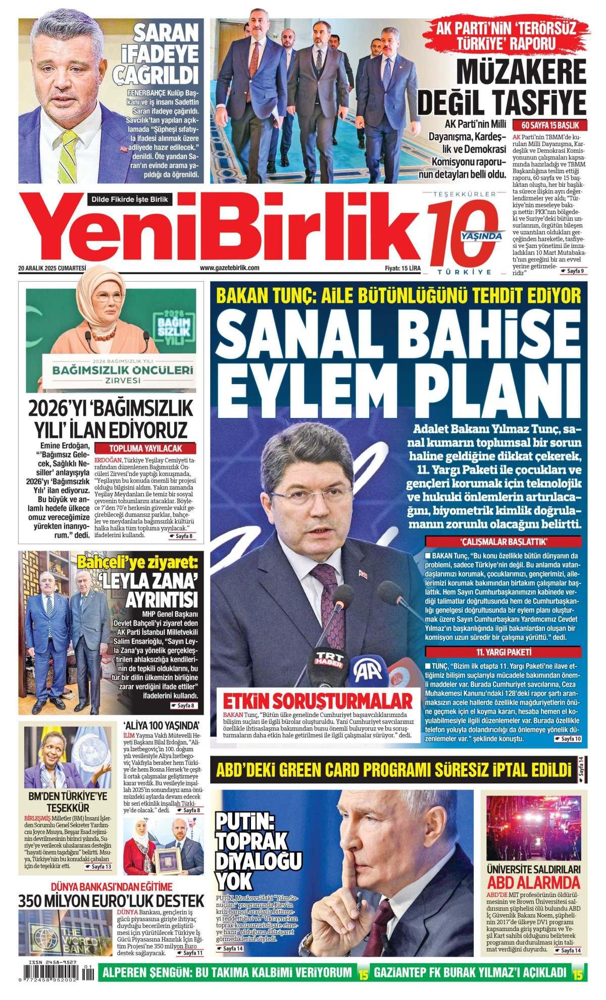 Yeni Birlik Gazetesi 20 Aralık 2025 Günü Manşeti