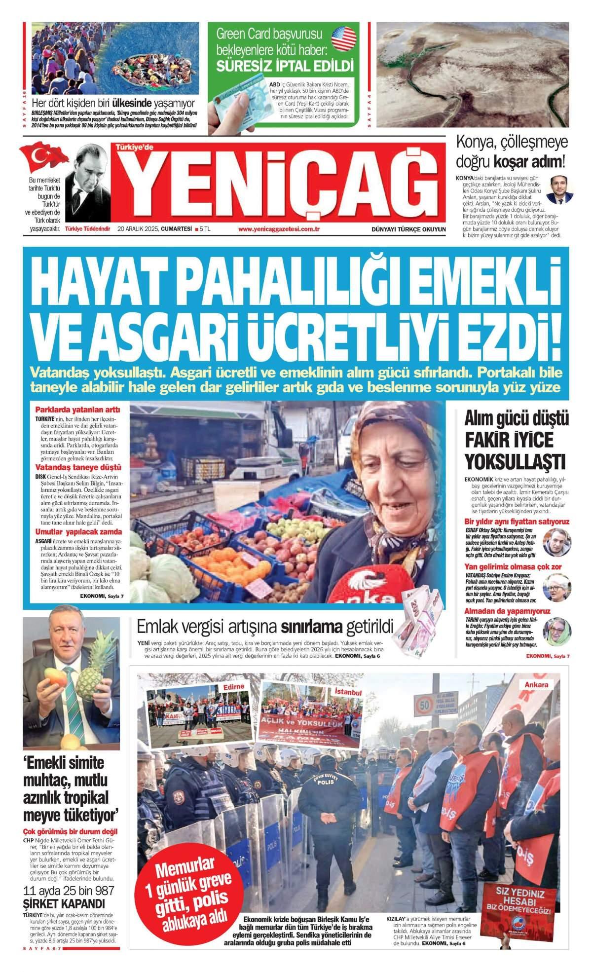 Yeni Çağ Gazetesi 20 Aralık 2025 Günü Manşeti